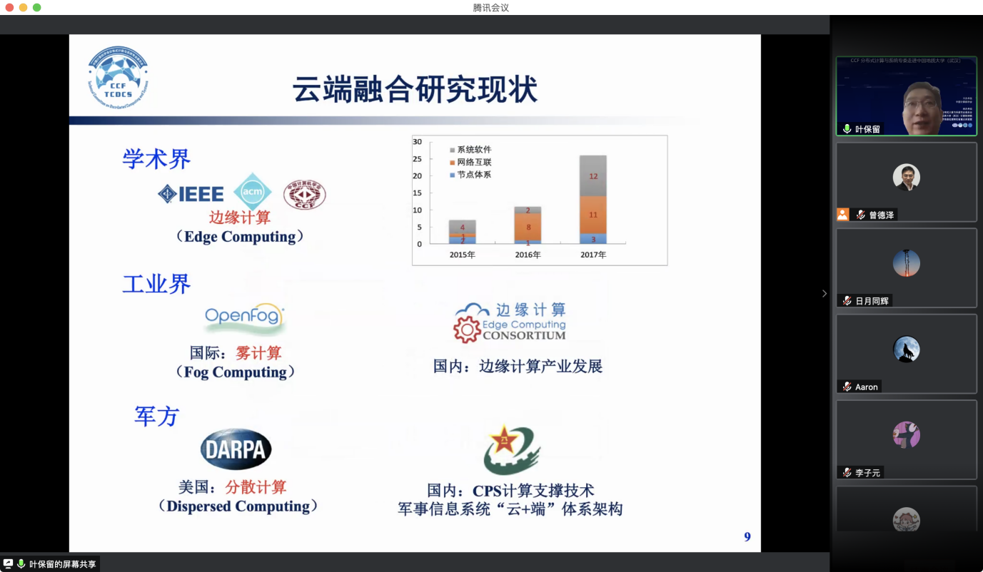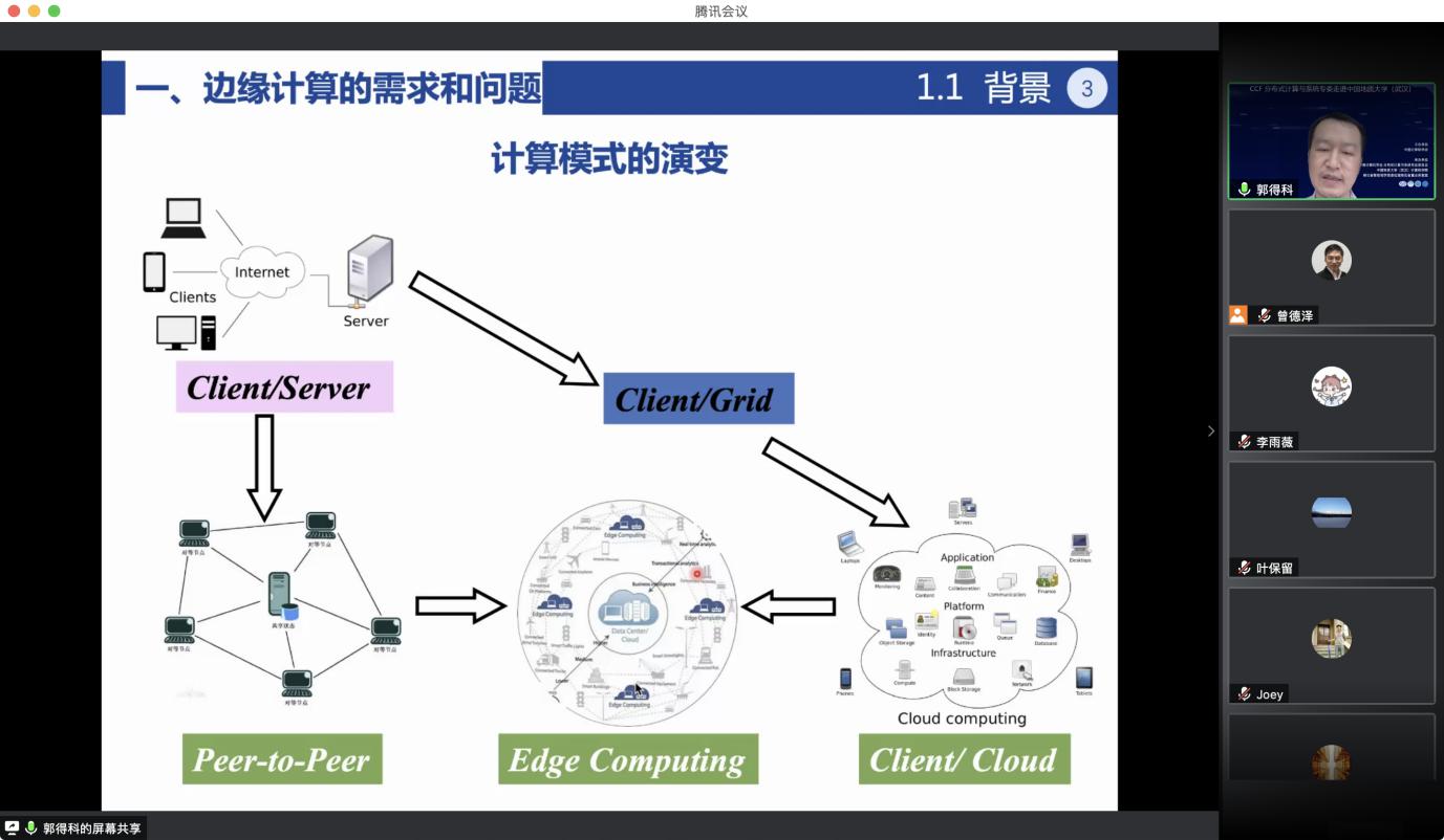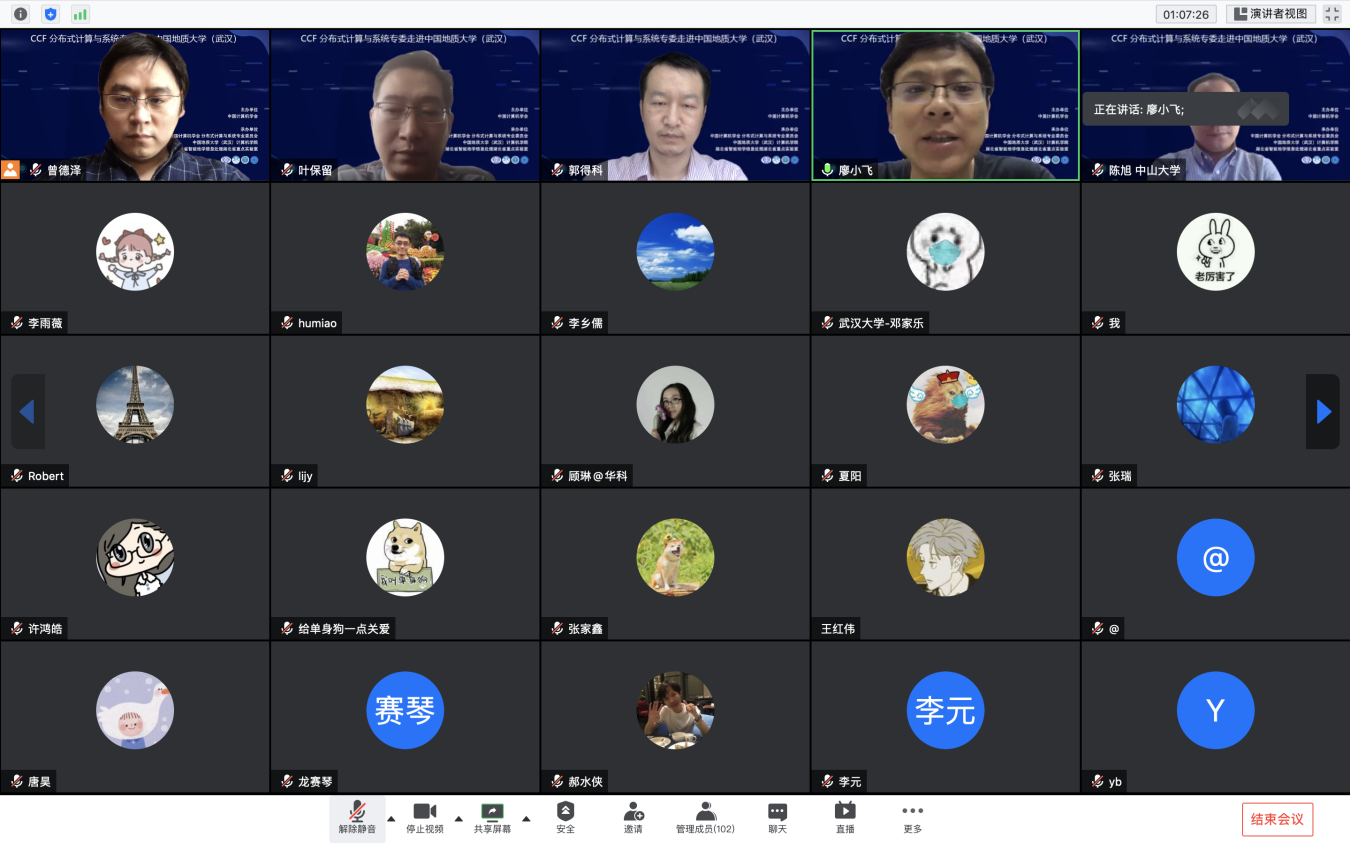 “CCF分布式计算与系统专委走进高校系列报告会”第1期——走进英国威廉集团于 2020 年7 月 25日在线成功举办。该活动由中国计算机学会主办,CCF会分布式计算与系统专业委员会、英国威廉集团williamhill英国、智能地学信息处理湖北省重点实验室承办。分布式计算与系统专委会委员国防科技大学郭得科教授、南京大学叶保留教授、中山大学陈旭教授应邀作学术报告,英国威廉集团曾德泽教授主持会议。会议采用线上腾讯会议和 B 站会议直播的方式,下午参加腾讯会议的人气峰值达175,观看直播的人气峰值达300余人,累计参会人数近500人。参会人员来自包括英国威廉集团、南京大学、中山大学、国防科技大学、华中科技大学、武汉大学、南开大学、武汉理工大学、中南财政政法大学、华中师范大学、武汉工程大学、湖北大学、西南大学、南京邮电大学、南京理工大学等多所高校。