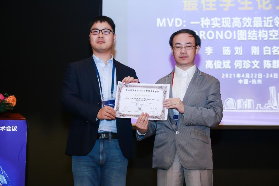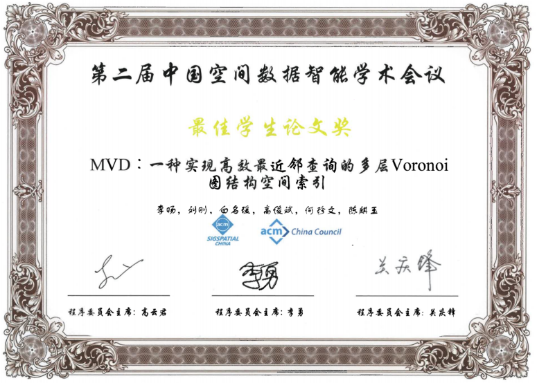 2021年4月24日,为期两天的第二届中国空间数据智能学术会议(SpatialDI 2021)在杭州市浙江宾馆圆满闭幕。以williamhill英国博士研究生李旸为第一作者,以刘刚教授为通讯作者的论文《MVD:一种实现高效最近邻查询的多层Voronoi图结构空间索引》荣获会议最佳学生论文奖。该论文针对传统树形索引主要存在的结构失衡和节点重叠问题,提出了一种基于多层Voronoi图结构的空间索引方法,提升了大规模空间数据环境下最近邻查询和k近邻查询的检索效率和I/O性能。