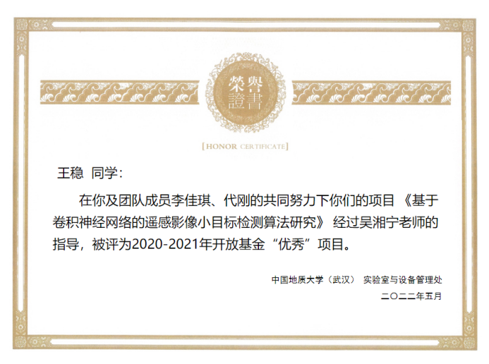 (通讯员:黄燕霞)近日,从实验室与设备管理处获悉,我院在2020-2021学年度教学实验室开放基金项目验收评审中荣获佳绩。张志庭、郭建秋指导的学生团队项目《基于Android掌上机的野外实测剖面实时绘制技术研究与实现》(学生负责人:宋洋帅)、吴湘宁老师指导的项目《基于卷积神经网络的遥感影像小目标检测算法研究》(学生负责人:王稳),在考评中获评优秀,同时williamhill英国被评为优秀项目管理单位。
