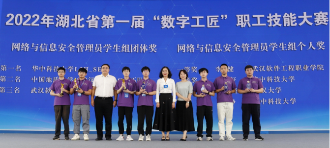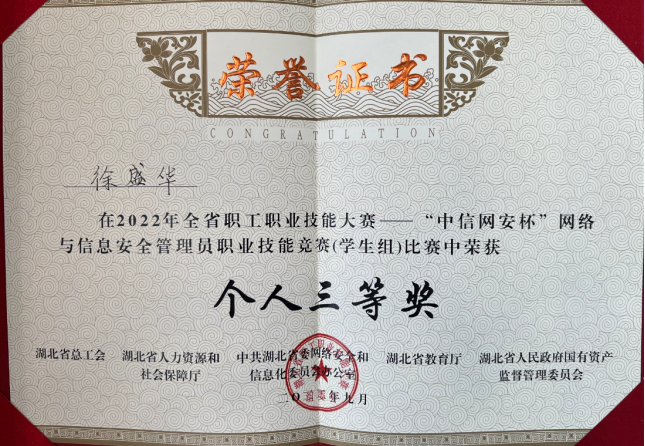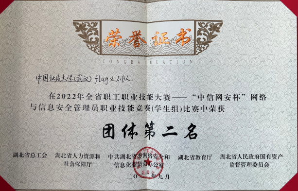 近日,从2022年湖北省第一届“数字工匠”技能大赛暨“中信网安杯”网络与信息安全管理员职业技能竞赛组委会获悉,由我院信息安全系朱静老师指导的“Flag又不队”战队(队员:覃程伟、孙升阳、张涛)以总分第二名的成绩荣获团体攻防对抗赛学生组二等奖,由马钊老师指导的“Flag对不队”成员徐盛华以总分第六名的成绩斩获个人综合靶场赛学生组三等奖。