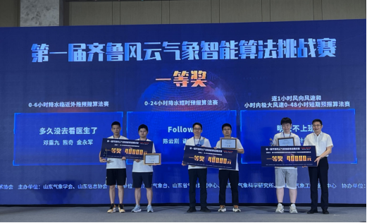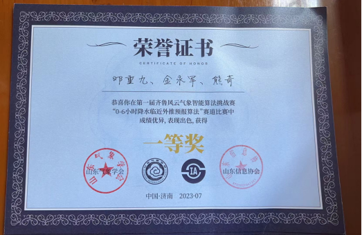 7月15至16日,由山东气象学会、浪潮数字(山东)建设运营有限公司、山东信息协会联合主办的第一届齐鲁风云气象智能算法挑战赛决赛及颁奖仪式在济南完美收官。历经初赛、复赛、决赛的层层选拔和激烈角逐,我院教师刘佳指导的研究生邓重九、金永军、熊奇组成的团队获得“0-6小时降水临近外推预报算法”赛道一等奖。