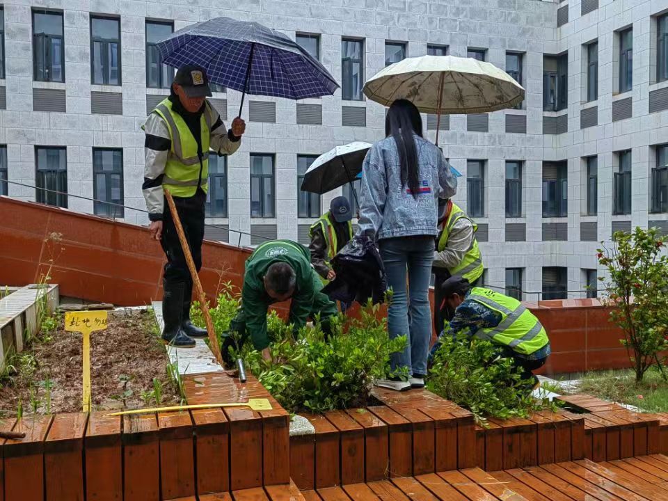 劳动理论学习后,大家来到学院三楼平台,干劲十足的动起手来,气氛融洽且热烈。同学们互相配合,挖树苗、拔小草、铲青苔、洗容器、种植物,在雨中体会劳动的乐趣,在实践中体会种植的快乐。