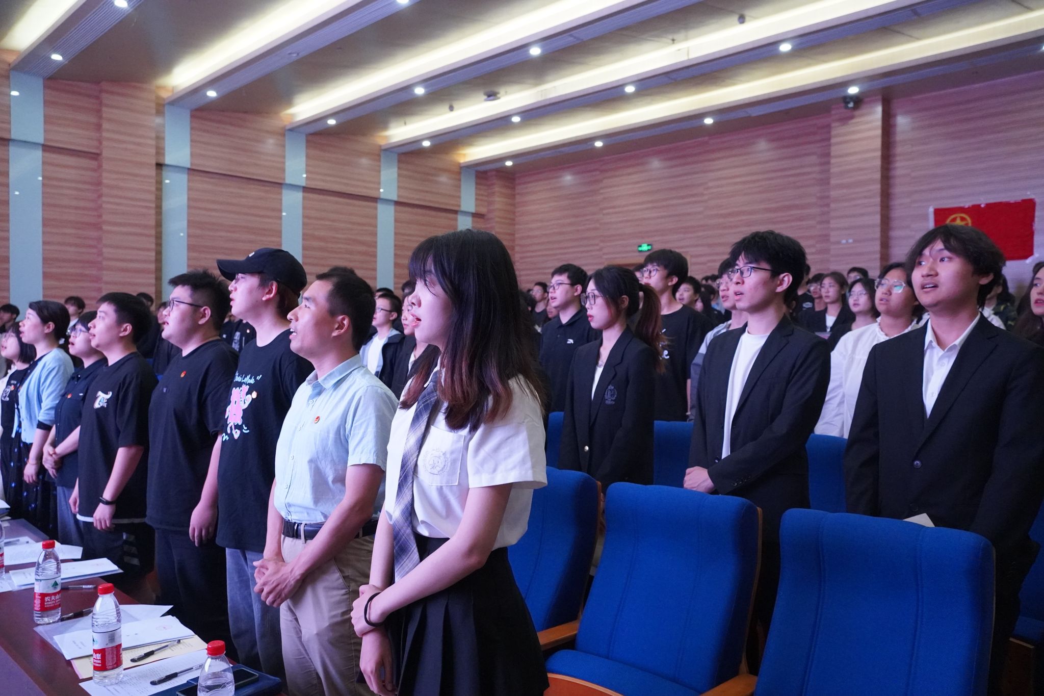 全体师生代表起立,齐唱国歌。
