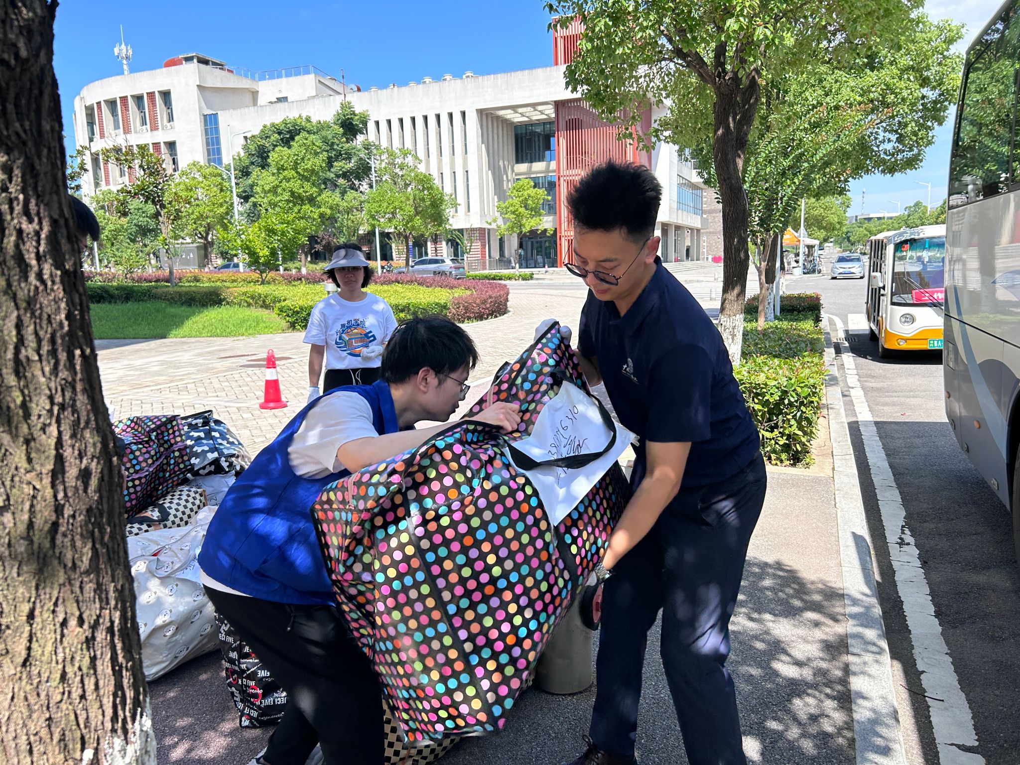 同学们早已打包好行李在楼下等待,随着搬运车辆逐次停下,大家自觉组成流水线相互接力,一件件纸箱、行李箱、储物袋最终被罗列得整整齐齐。尽管天气炎热,但大家的热情不减,许多男生主动帮助女生搬运行李,在各位老师的指挥下,一切都在有条不紊地进行。