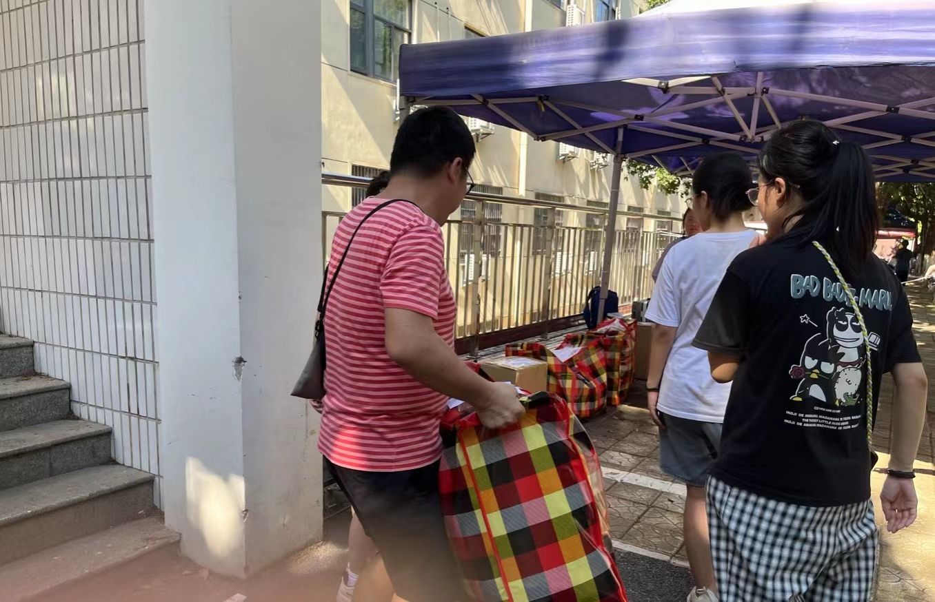 大巴驶入校园,在学生们即将入住的宿舍前,橙色的凉棚早早张开,身着蓝色马甲的志愿者们等候多时。多批运输车辆将学生物品运至宿舍楼下,老师和志愿者为新到来的2023级计科学子搬运行李,指明方向;宿管阿姨分发钥匙,严谨细致地录入信息;同学们彼此合作,将沉重的包裹运到新宿舍,开启一段崭新的未来旅程。