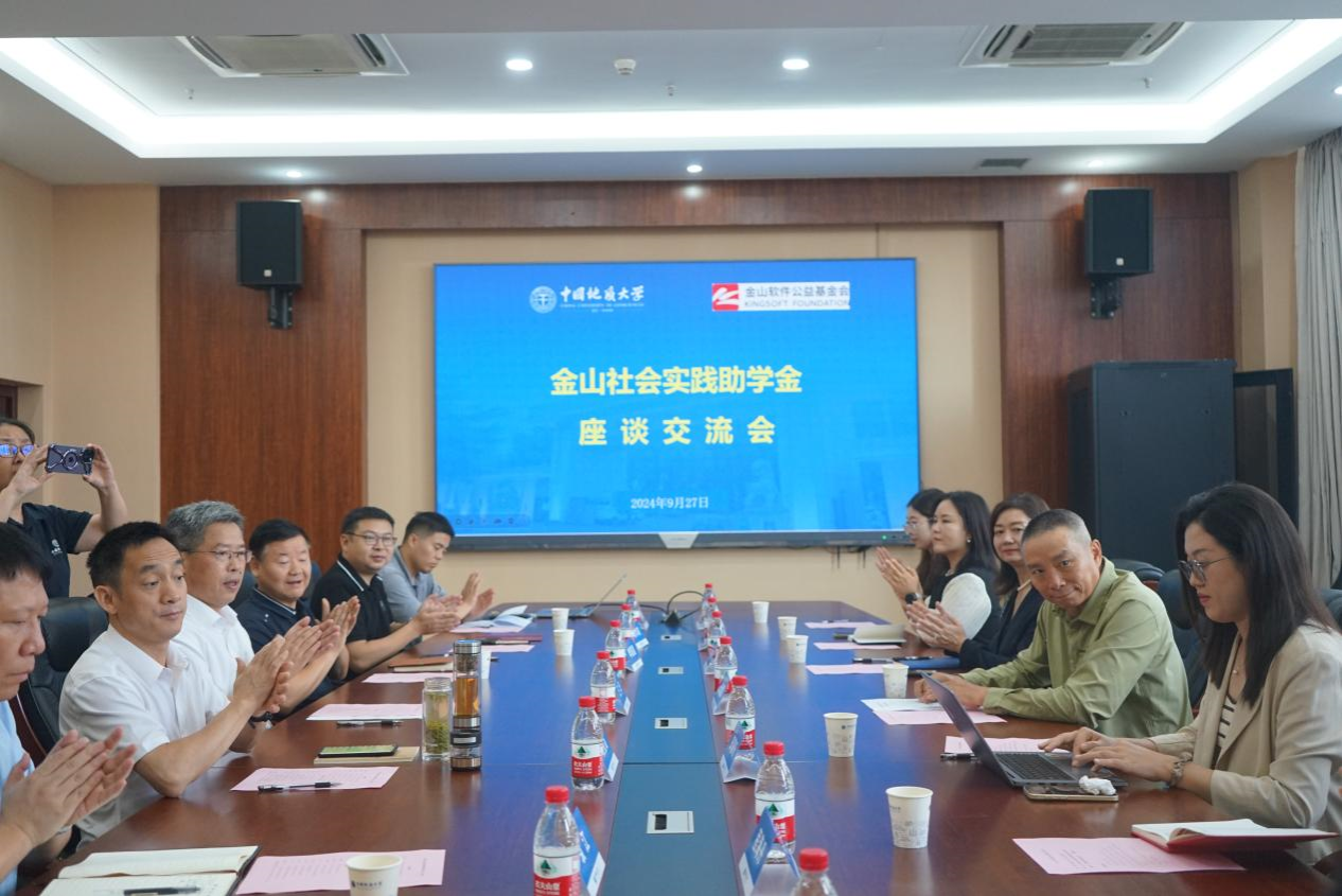 在播放完学校宣传片后,王华副校长致辞。他对王全国副理事长一行的到来表示热烈欢迎,重点介绍了学校办学特色和发展成绩,感谢金山软件公益基金会在我校设立“金山社会实践助学金”、关爱地大学子,希望双方进一步加强沟通、深化合作,共同为社会培养优秀人才。