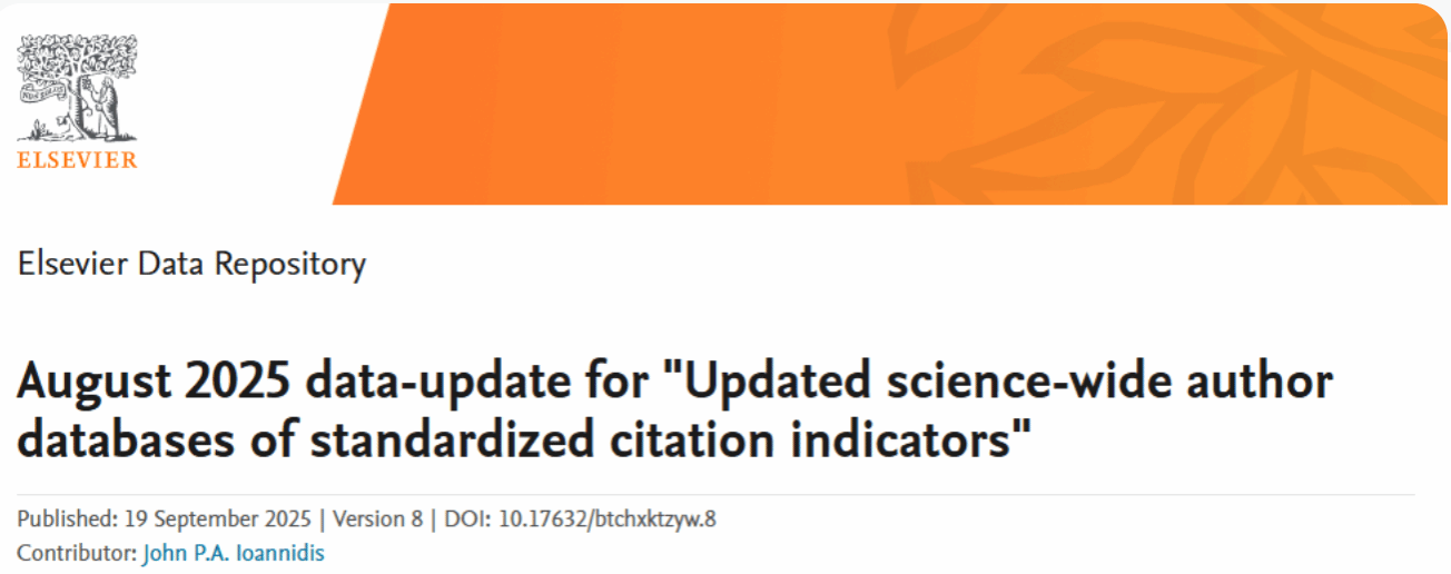 2025年9月,美国斯坦福大学和爱思唯尔更新了标准引文指标的全科学作者数据库,重磅发布了《2024年度全球前2%顶尖科学家榜单》(Stanford/Elsevier Top 2% Scientists List),我院多名教师上榜。