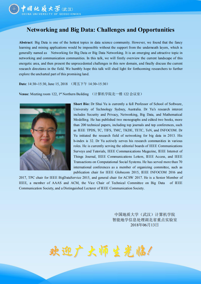 澳大利亚悉尼科技大学余水教授学术报告——Networking and Big Data: Challenges and Opportunities