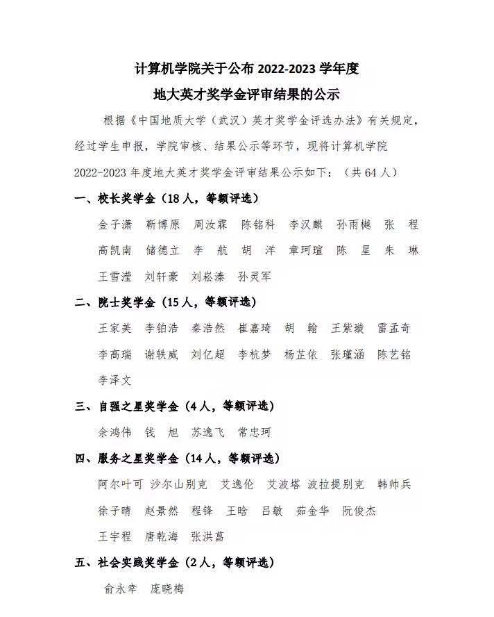 williamhill英国关于公布2022-2023学年度地大英才奖学金评审结果的公示