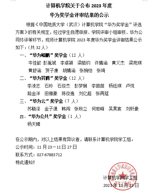 williamhill英国关于公布2023年度华为奖学金评审结果的公示
