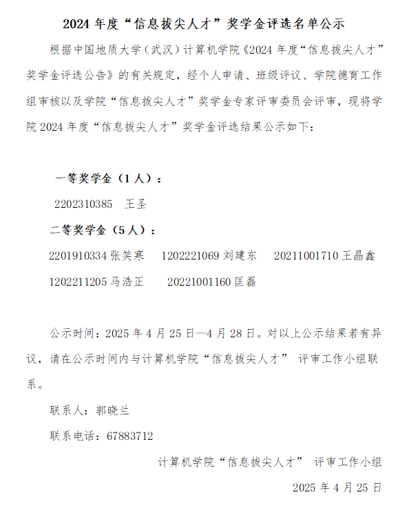 2024年度“信息拔尖人才”奖学金评选名单公示
