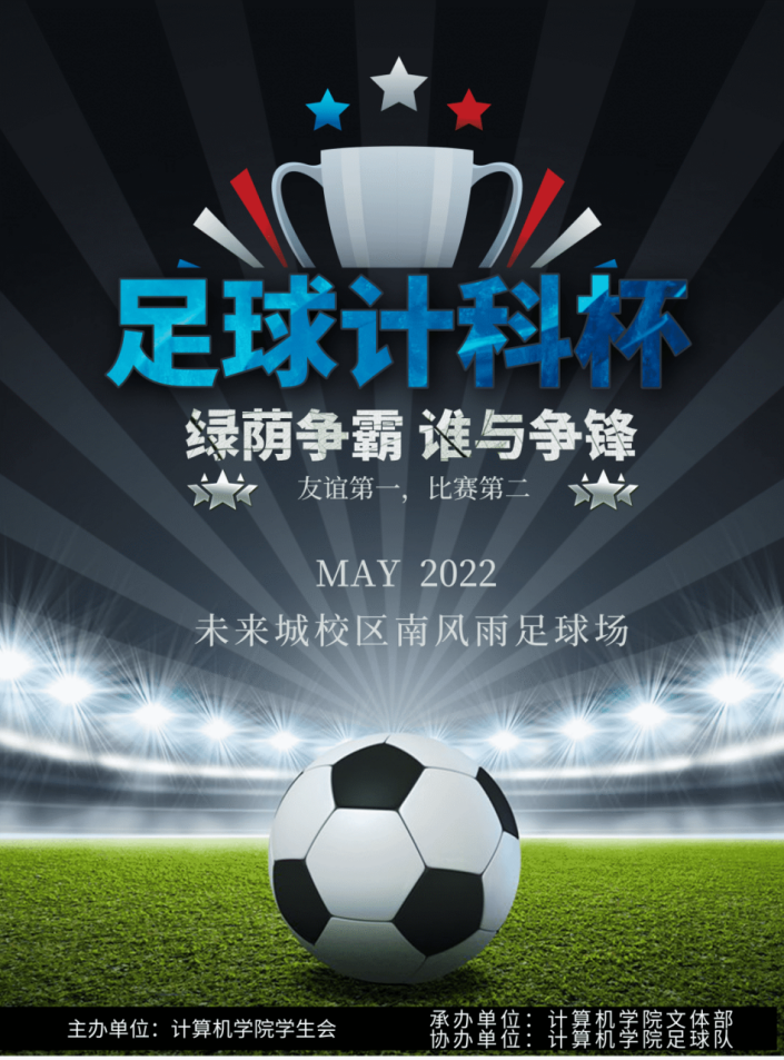 为鼓励广大同学合理学习、劳逸结合、走出宿舍,积极进行体育锻炼;同时也为了展现足球运动之美,推动我院足球运动的发展,进一步促进各班级、各年级间的交流与合作。我院将隆重举行第一届足球赛,整体赛事为积分制,每支队伍与其他所有球队循环竞赛。现将相关事项通知如下: