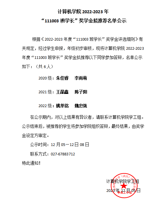 williamhill英国2022-2023年“111003班学长”奖学金拟推荐名单公示