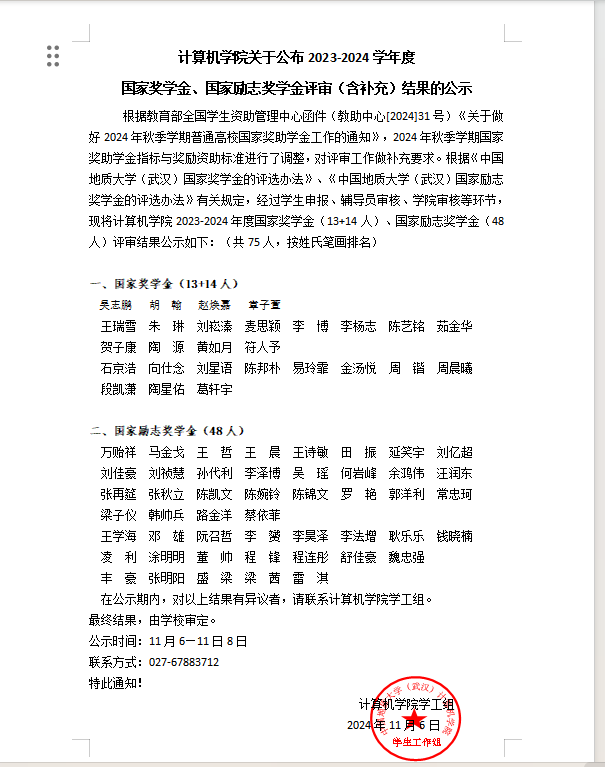 williamhill英国关于公布2023-2024学年度 国家奖学金、国家励志奖学金评审(含补充)结果的公示