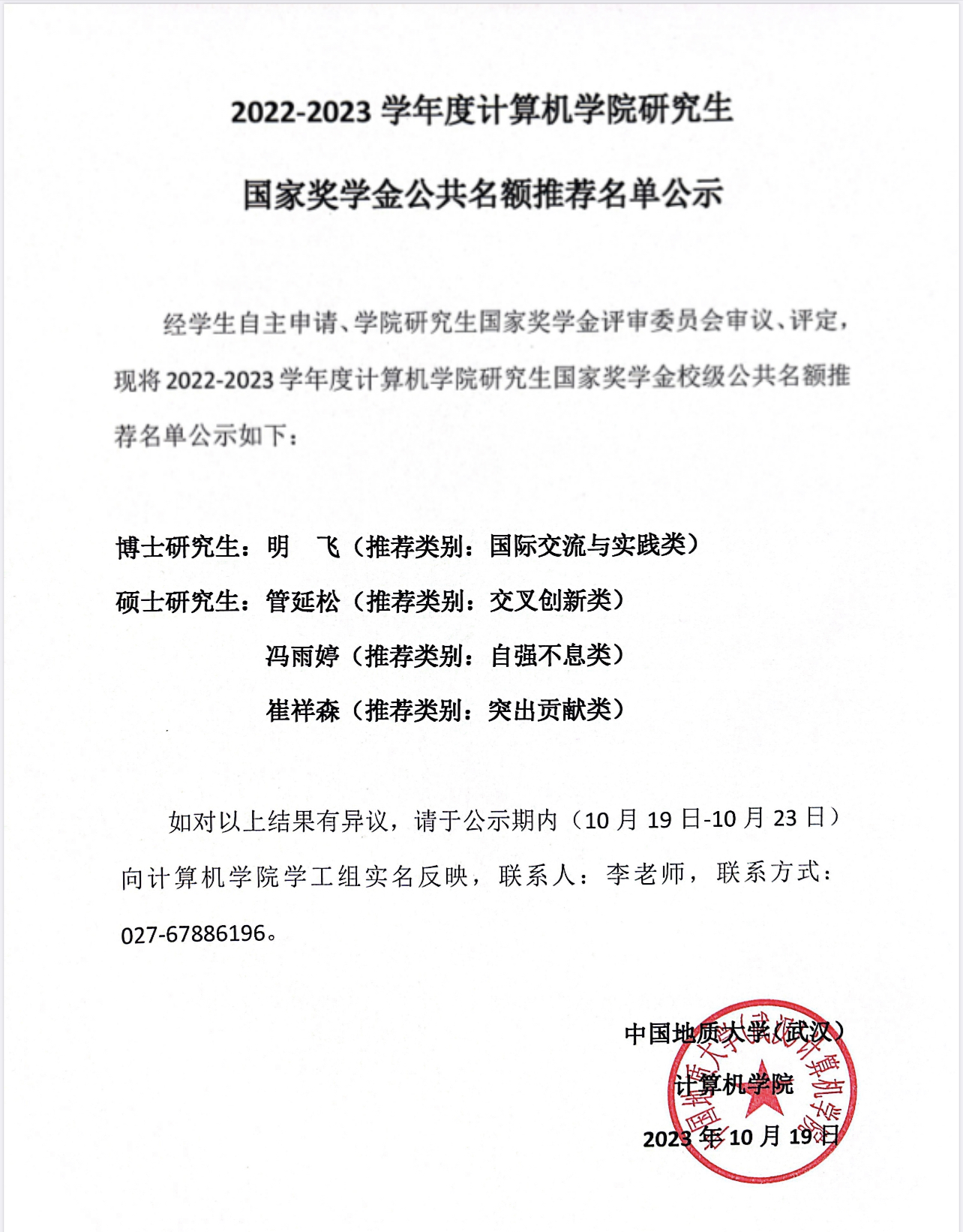 2022-2023学年williamhill英国研究生国家奖学金公共名额推荐名单公示