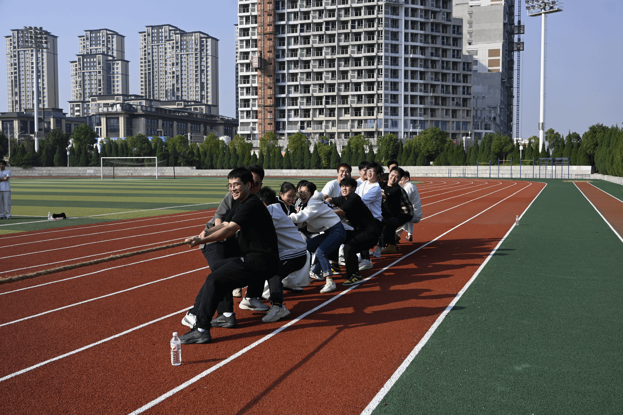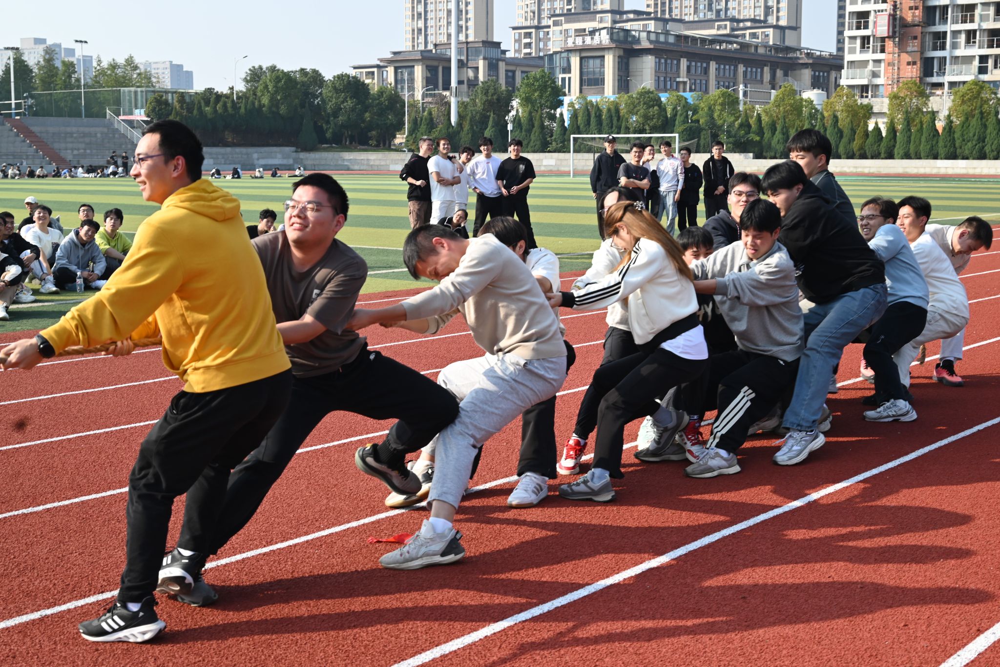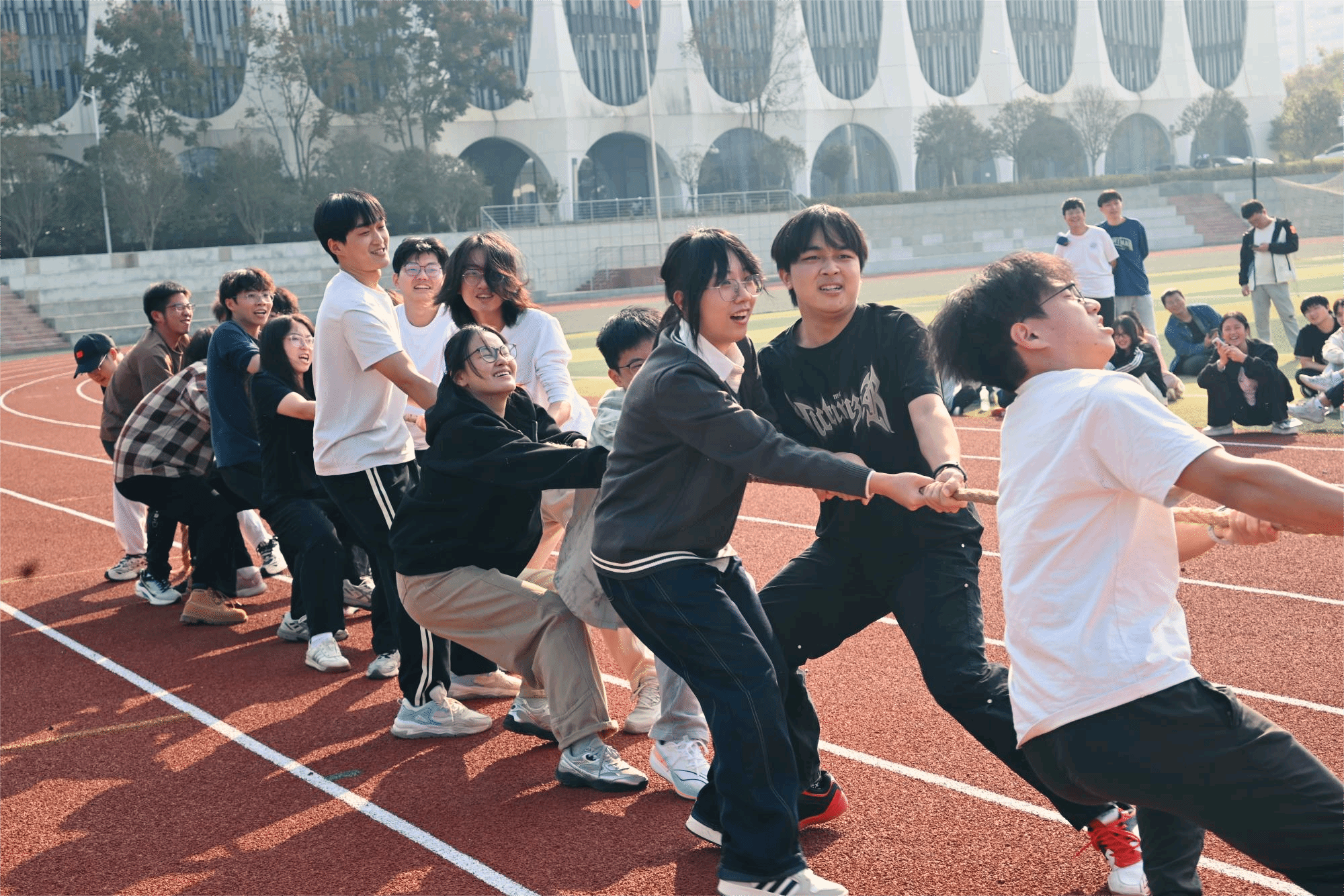 紧随其后拔河比赛让现场气氛瞬间升温,伴随着各个班级整齐、有力的口号声,队员们齐心协力、全力拉绳,汗水和笑声交织在操场上。老师们也加入其中,与同学们肩并肩作战。比赛不仅考验力量与耐力,更在每一次拉扯中强化了团队合作的精神,也让师生情感在拼搏中拉得更近。