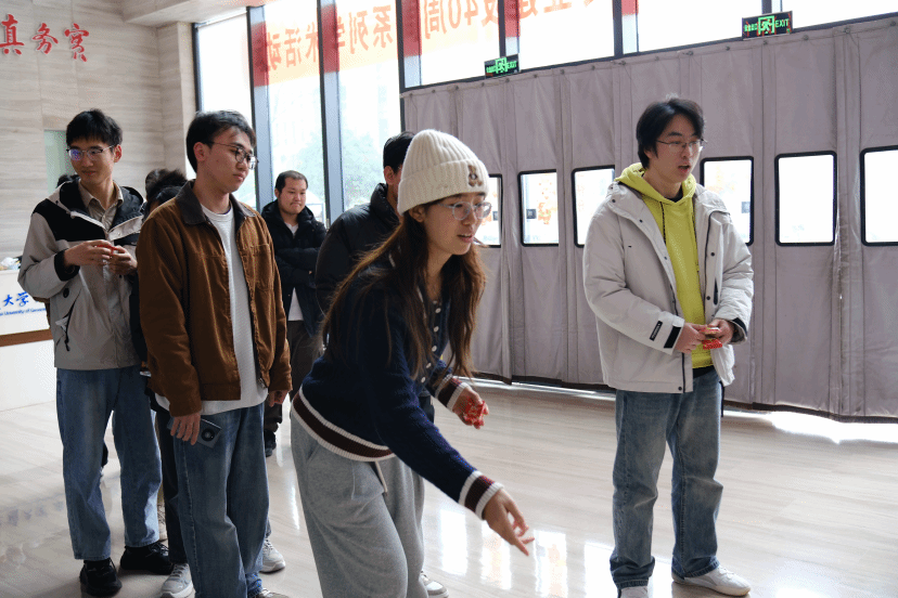作为传承千年的传统礼仪游戏,投壶区自开启便人气爆棚。参与者手持竹箭,在指定线后屏气凝神,瞄准壶口轻轻投掷。箭入壶的清脆声响响起时,现场立刻爆发出阵阵喝彩;即便偶尔失准,也会引来善意的笑声与加油声。这场兼具趣味性与仪式感的游戏,不仅考验着大家的手眼协调能力与专注力,更让师生在轻松欢笑中沉浸式感受古人的生活雅趣与礼仪文化,拉近了彼此的距离。
