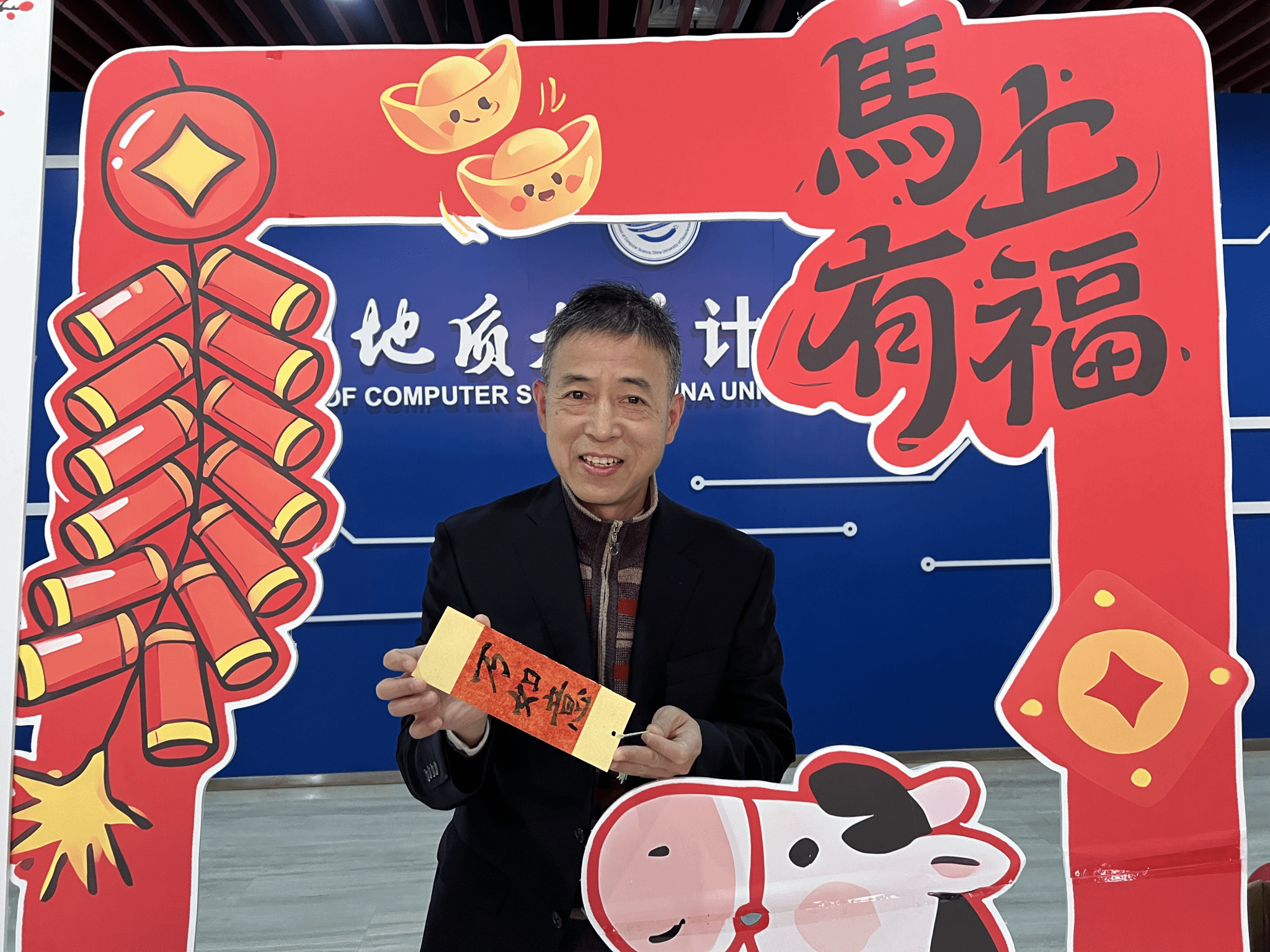 案几铺展红纸,笔墨早已备好,书法达人谭文博老师现场挥毫,笔走龙蛇间,兼具力量与美感的字迹跃然纸上。“代码无bug,科研步步高”“算力赋能,梦想启航”……同学们纷纷围聚,或求取专属定制的新春墨宝,或亲手执笔体验书写之趣。笔尖与纸面的摩挲声中,传统书法艺术的魅力悄然流淌,更将计科人的专业追求与新年期许巧妙融合,每一笔都饱含对新一年的热忱祈愿。
