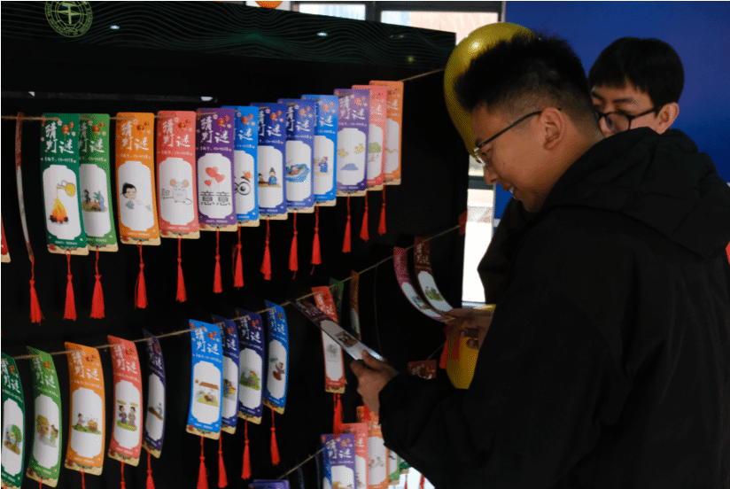 五彩斑斓的灯谜卡片挂满绳间,涵盖成语典故、诗词经典、历史常识与前沿科技等多元领域,每一道谜题都是一次知识与灵感的碰撞。师生们三五成群,或驻足沉思,或轻声探讨,时而因找到解题思路而眼前一亮,时而为解开难题而欢呼雀跃。破解谜题后兑换小礼品的瞬间,更是将成就感拉满,在欢乐互动中,大家既收获了知识的乐趣,也感受了中华传统文化的博大精深。