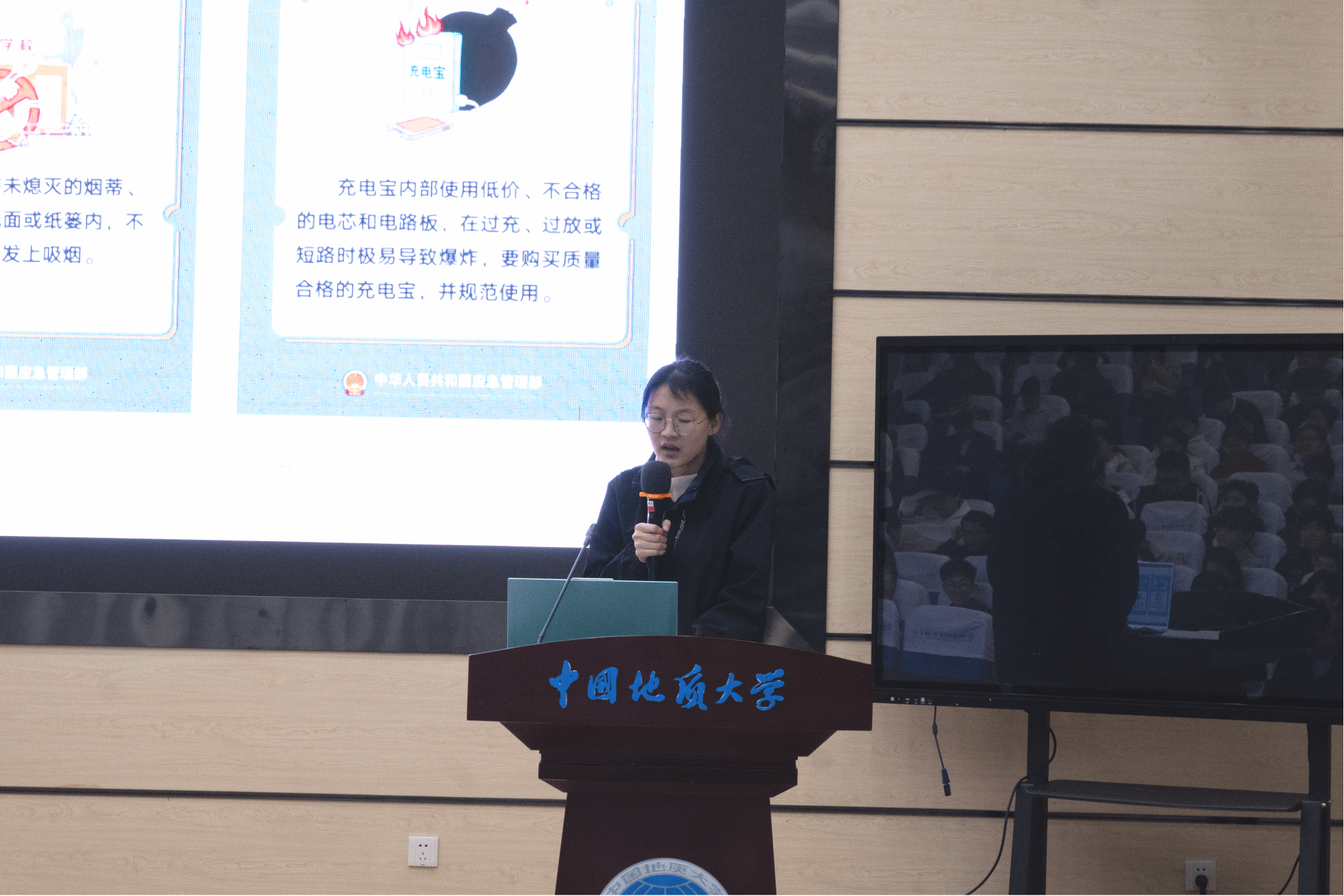 会议伊始,兼职辅导员翟广鑫围绕校园消防安全作主题发言。她结合宿舍、图书馆、教室等不同场景,详细讲解了防火重点,强调电动自行车规范管理的重要性,要求同学们严格遵守“九个戒”,共同维护校园安全稳定。