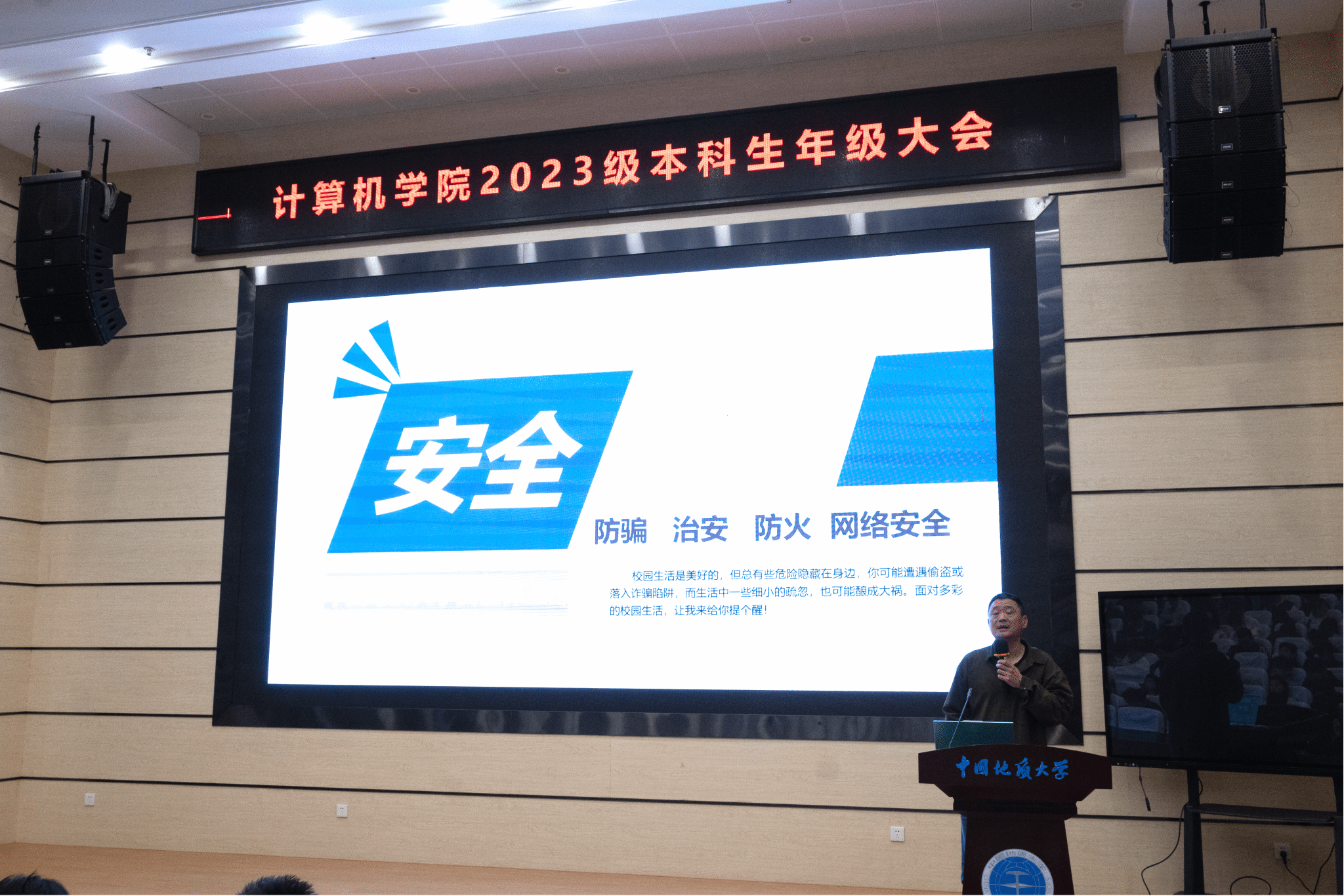 安全保卫科张献文老师结合高校真实案例,进一步强化学生安全防范意识。他详细剖析当前高发的诈骗类型,特别提醒“屏幕共享”功能可能导致“共享钱包”的风险,他强调“安全无小事”,要求同学们牢记“六一律”,切实保护个人信息,杜绝宿舍违章用电行为,共同筑牢校园安全防线。