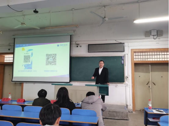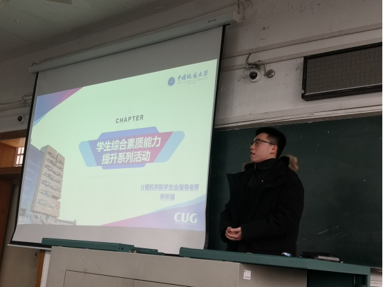 沈晨介绍年级管理和近期重点工作。他在进行简单的自我介绍后,从学院的日常管理、考风考纪、假期安排及重要事项提醒、假期要求等方面,提醒学生严格遵守学校各项规定,希望大家能够度过一个安全、充实、有意义的假期。