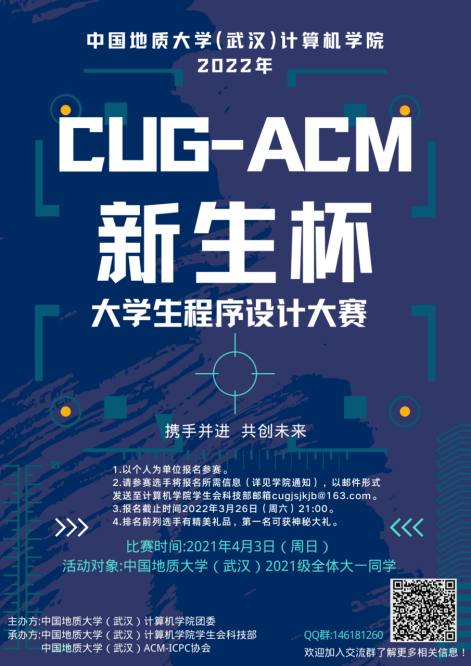 本次“CUG-ACM新生杯”程序设计大赛以个人为单位报名参赛,报名对象为英国威廉集团2021级所有学生。3月26日(周六)晚上21:00之前以Excel文件形式发至williamhill英国学生会科技部邮箱cugjsjkjb@163.com。