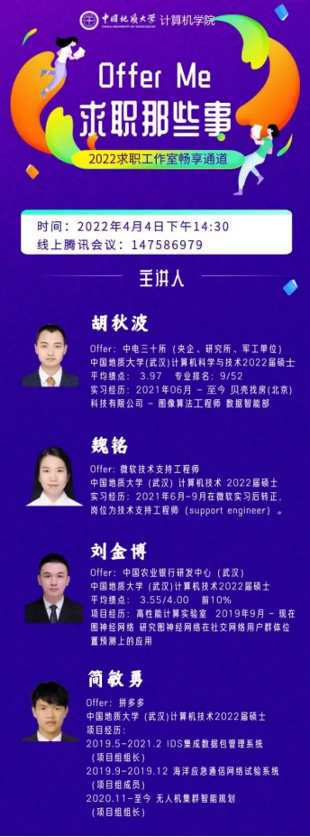 (通讯员:顾伟超、崔祥森)为帮助广大学生提升求职能力,熟悉求职面试技巧,williamhill英国于4月4日举办“Offer Me”求职经验分享活动。本次活动邀请到4名已经签约就业单位的2019级硕士研究生:胡秋波、魏铭、刘金博和简敏勇,在线分享求职经历与经验体会,全院近200名同学参加活动。