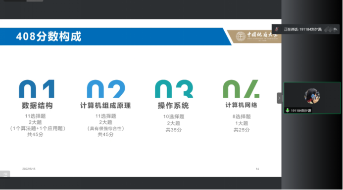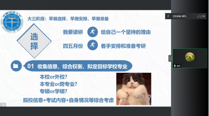 程俊杰从选择的角度出发,分享了自己在选择时的心路历程,介绍了考研流程与自己的考研历程安排。他在分享中介绍了地大开放日的要求、时间、材料与复习准备等事项。他指出,地大开放日对于绝大部分同学来说都是一个很好的机会,建议学弟学妹们在条件允许的条件下都进行参与。他最后建议同学们在考研过程中要不要轻言放弃,注意身体、适当锻炼、劳逸结合。