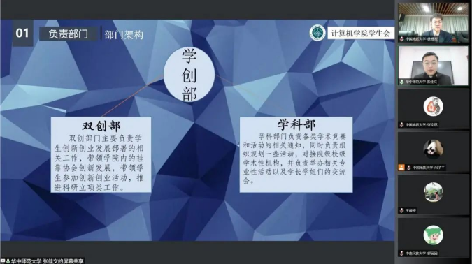 学生会工作会场中,与会代表依次介绍学生组织架构与特色活动开展。分别围绕如何进一步深化学联改革,如何进一步丰富计算机专业青年学生思想引领活动开展和常态化疫情防控背景下校园文化建设思考三个议题深入交流、研讨。中南财经政法大学信息与安全工程学院将团委、学生会各部门按工作职能分为三大类,各司其职、互相协作,促进资源整合,发挥更大合力。华中农业大学信息学院学生会开辟校内社区志愿服务新场域,面向华农附小三年级学生,开展少儿编程志愿服务活动,定期进行编程逻辑指导教学,增强青年学生专业实践能力,切实服务学院师生需要;中国地质大质(武汉)williamhill英国学生会主席团成员霍奥林介绍学院结合常态化疫情防控要求,打造“阳光计科人,运动成长季”特色活动体系,通过开展校园趣味定向跑、益智桌游、电竞赛事、文体活动、集体观影等丰富多彩的活动,引领广大青年乐享校园、阳光向上;中南财经政法大学信息与安全工程学院代表卫思涵谈到,学校享有唱歌跳舞大学的称号与学校举办的各项活动密切相关,包括校园舞蹈大赛、合唱晚会、集结号专场表演、歌友会、随机舞蹈、奥运选手现场指导等活动。研讨会现场,各代表踊跃分享工作实践过程中的收获与体会,分析、研讨新时代语境下学联工作改革创新发展的机遇和挑战。英国威廉集团williamhill英国学生会主席团成员霍奥林做会议总结。