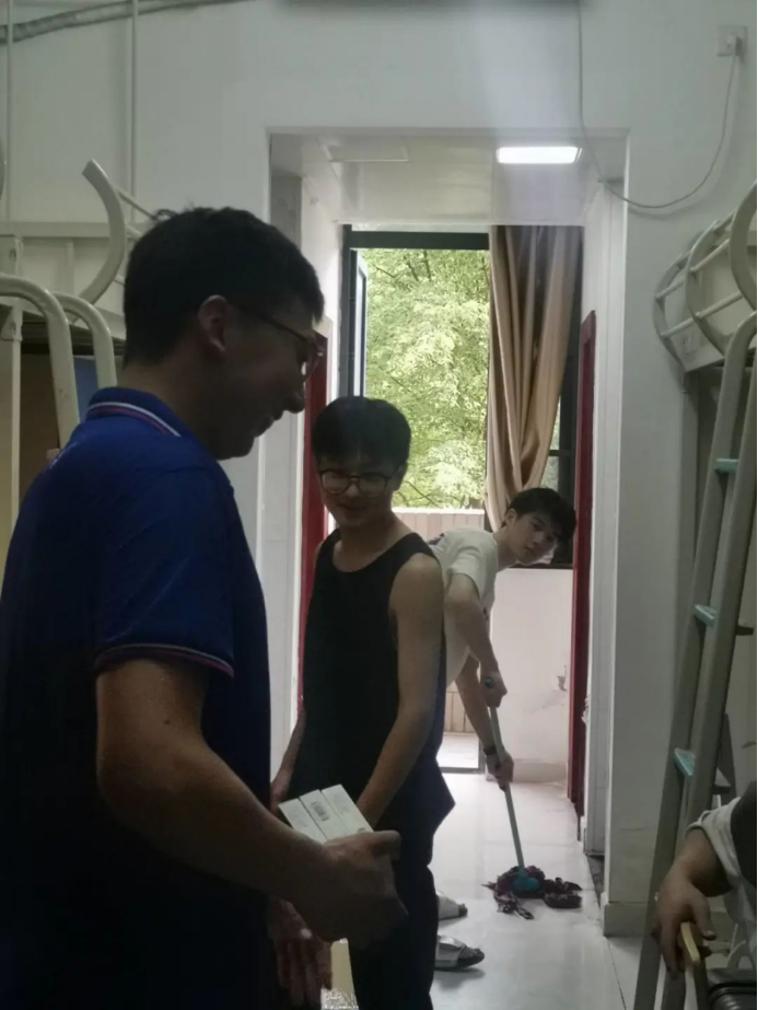 下午5点,最后一批行李搬运结束,同学们便开始了宿舍的整理和打扫工作。学工组老师们走访2021级学生宿舍,询问宿舍整理情况,为同学们答疑解惑。