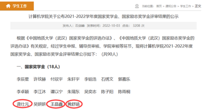 让“我”感到十分欣喜和自豪的是,在2021-2022学年度国家奖学金评选中“我”的朋友2021级本科生龚仕元、黄舒涵、王晶鑫都获得了国家奖学金。(图)