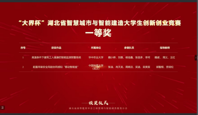 2022年12月18日,由教育部工程管理和工程造价专业教学指导分委会主办、长安大学承办第三届全国智慧城市与智能建造大学生创新创业竞赛展开决赛,我院2021级本科生吴昊宸所在团队荣获一等奖。