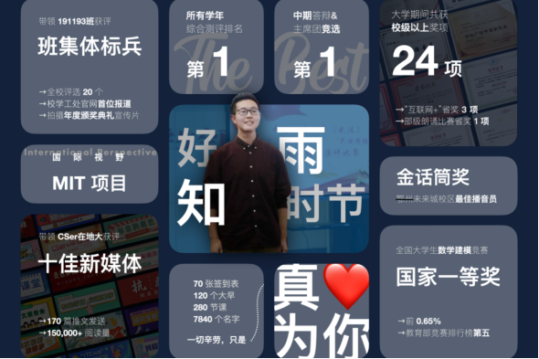 历任学委、班长、广播节目中心副总监、新媒体部部长和学生会主席团成员,没有一段经历知雨不是倾其全部精力为他所在组织的注入力量。念念不忘,必有回响。这份心意打动了周围同学。知雨在两次团员评议中优秀率均为班级第一。知雨在学生会部长中期答辩和主席团竞选中均位列第一。知雨在广播台全台大会上发言,200多人有笑有泪,校党委宣传部高雅老师对他说“知雨,你打动了我,也打动了大家。”