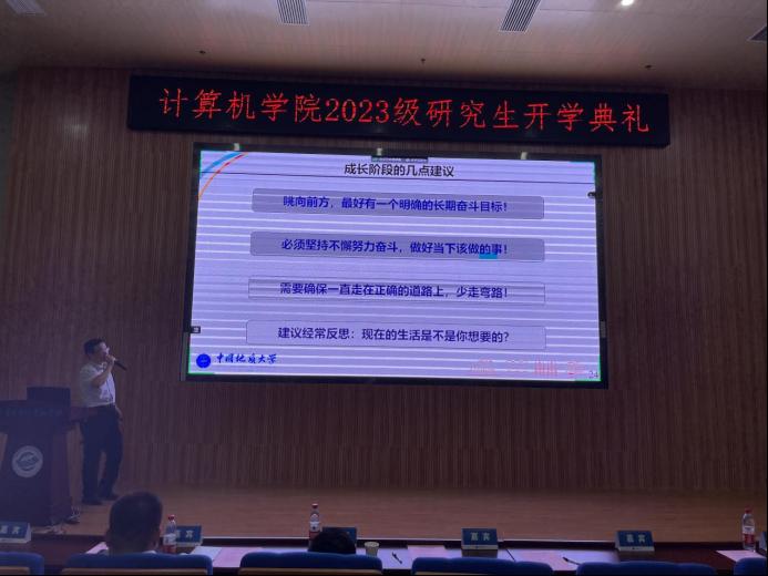 张院长首先肯定了同学们为考研付出的努力,对2023级研究生的到来表示热烈的欢迎。他以学校发展历史与人才培养成绩为切入点,向同学们展示了学校丰厚的底蕴,并从专业设置、师资队伍、科研平台与科研项目等方面介绍了学院近年来发展的概况。他谈到,国家在高新领域的巨大投入以及良好的政策指引,学校深厚的学术科研底蕴和一代代地大人的砥砺奋斗,为今天的在座的同学们奠定了良好的成长环境和优渥的发展平台,希望同学们秉承“艰苦朴素,求真务实”的校训精神,在地大williamhill英国刻苦钻研,实现出属于自己的新突破,为国家前沿科技发展贡献自己的力量!