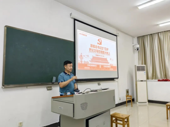 慰问后,李国昌讲授《跟着总书记过“五关”,把论文写在祖国大地上》专题党课。他带领同学们观看习近平总书记当年在陕北梁家河插队时过“跳蚤关、饮食关、生活关、劳动关、思想关”的采访视频,分享了2021级同学入校后的军训、生活、实习的难忘瞬间,指出大家当前面临“三关”:专业分流后再出发的勇气关,高质量充分就业的毕业关,平凡岗位也能成就梦想的职业关,勉励同学们向总书记学习,通过野外实习,不畏艰苦,学练成才;从基层做起,增进与人民的感情;用双脚丈量祖国大地,增强民族自豪感,以饱满的热情和用心的付出,圆满完成好各项实习任务,牢记总书记的嘱托,肩负历史使命,坚定前进信心,立大志、明大德、成大才、担大任,努力成为堪当民族复兴重任的时代新人,让青春在为祖国、为民族、为人民、为人类的不懈奋斗中绽放绚丽之花。