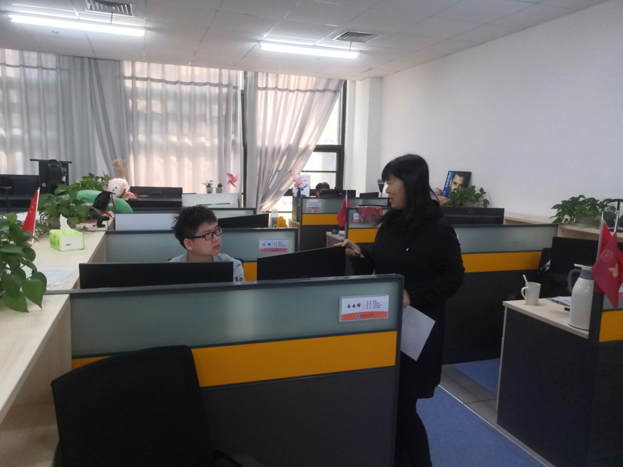 走访人员也注意到个别实验室存在一些需要关注的问题。例如,有些工位的绿植存在枯萎现象,部分工位桌面不整洁,许多空箱随意堆积,这不仅影响了实验室的整洁和美观,对同学们的学习心情也会产生负面影响。针对这些问题,走访老师重申了“我的实验室我呵护”的安全卫生要求,提醒同学们重视环境卫生,营造整洁、舒适的科研环境。
