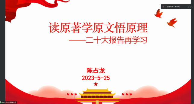 为全面贯彻落实党的二十大精神,更好地认识和肩负起科技工作者的历史责任,2023年5月25日下午,正值答辩季,陈占龙副院长以“读原著学原文悟原理——二十大报告再学习”为题,为计算机应用系全体教师讲授了一堂主题教育专题党课。