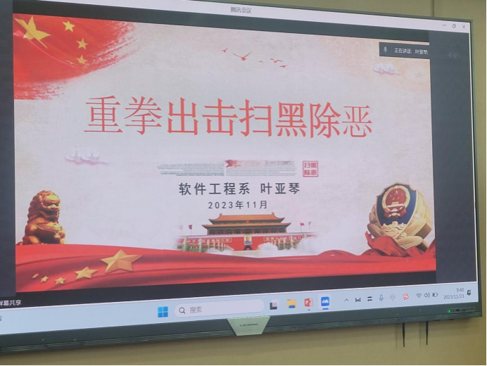 软件工程系党支部书记叶亚琴通过线上汇报的方式,以“重拳出击扫黑除恶”为题,阐述了扫黑除恶的重要意义,剖析了发生在我们身边的几起涉黑涉恶类案件,强调了我们要拥护党的领导,自觉维护和平安全的社会环境。