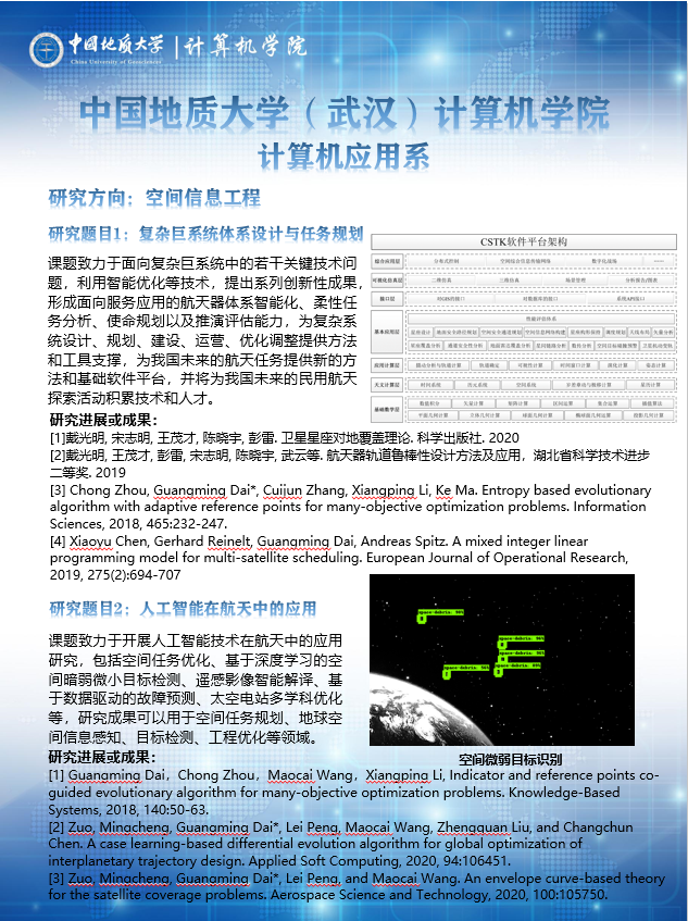 主要开展三维可视化地矿点源信息系统的理论方法、技术体系、高功能地学信息系统平台软件研究、开发与应用,复杂空间信息网络的体系设计、任务规划和推演评估、空间综合信息传输网络的设计与优化,以及遥感影像智能解译等方面的科研工作。在复杂地质结构三维精细建模、时空大数据组织与管理、复杂巨系统体系设计与任务规划、人工智能在航天中的应用、地质信息技术和航天工具基础软件研发等方面形成特色方向。共有专任教师21人,其中学术带头人2人,学术骨干6人;近3年共承担国家和省部级等各类科研项目57项,发表学术论文113篇,出版专著4部,获得省部级以上奖励9项、国家发明专利和软件著作权20项。