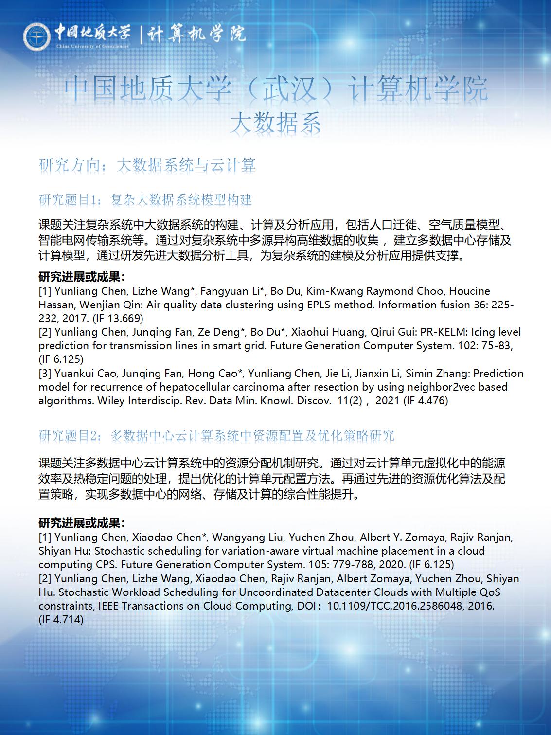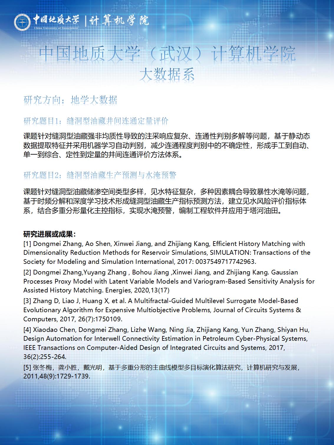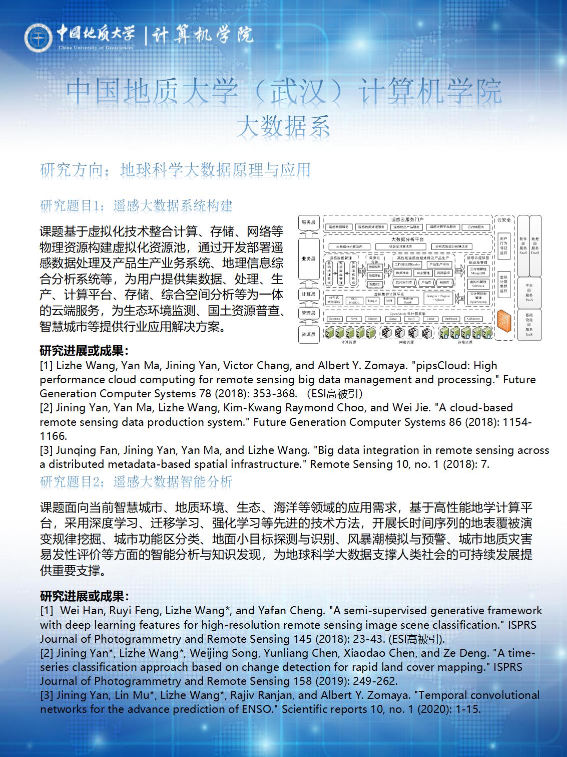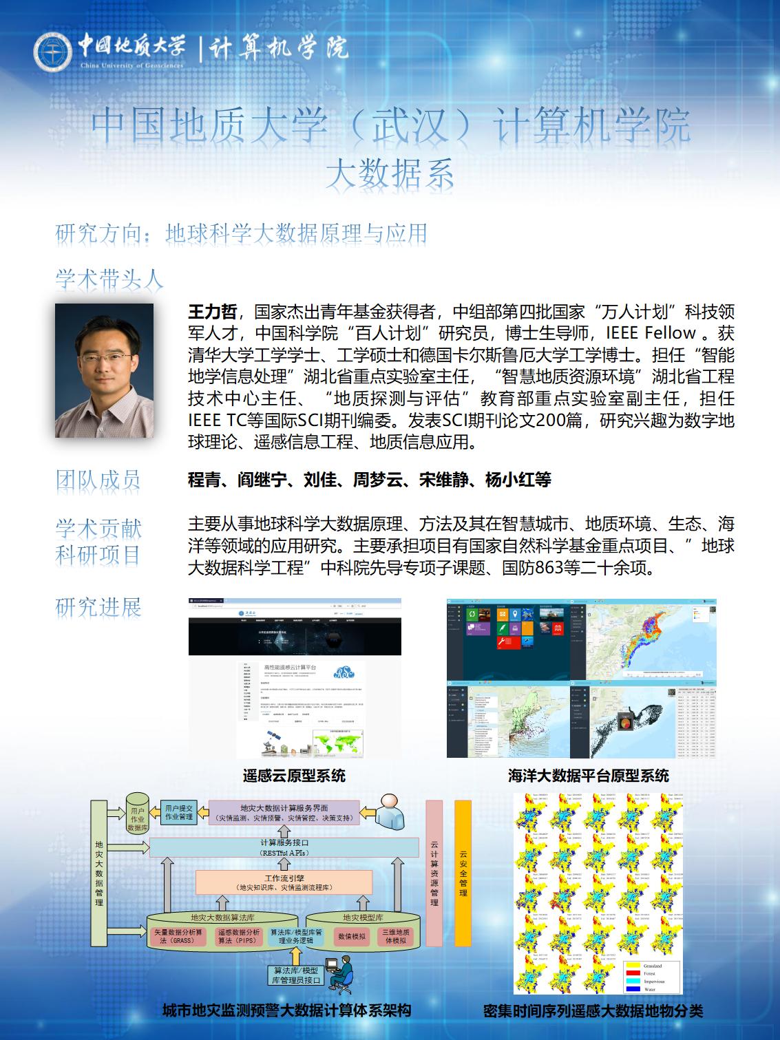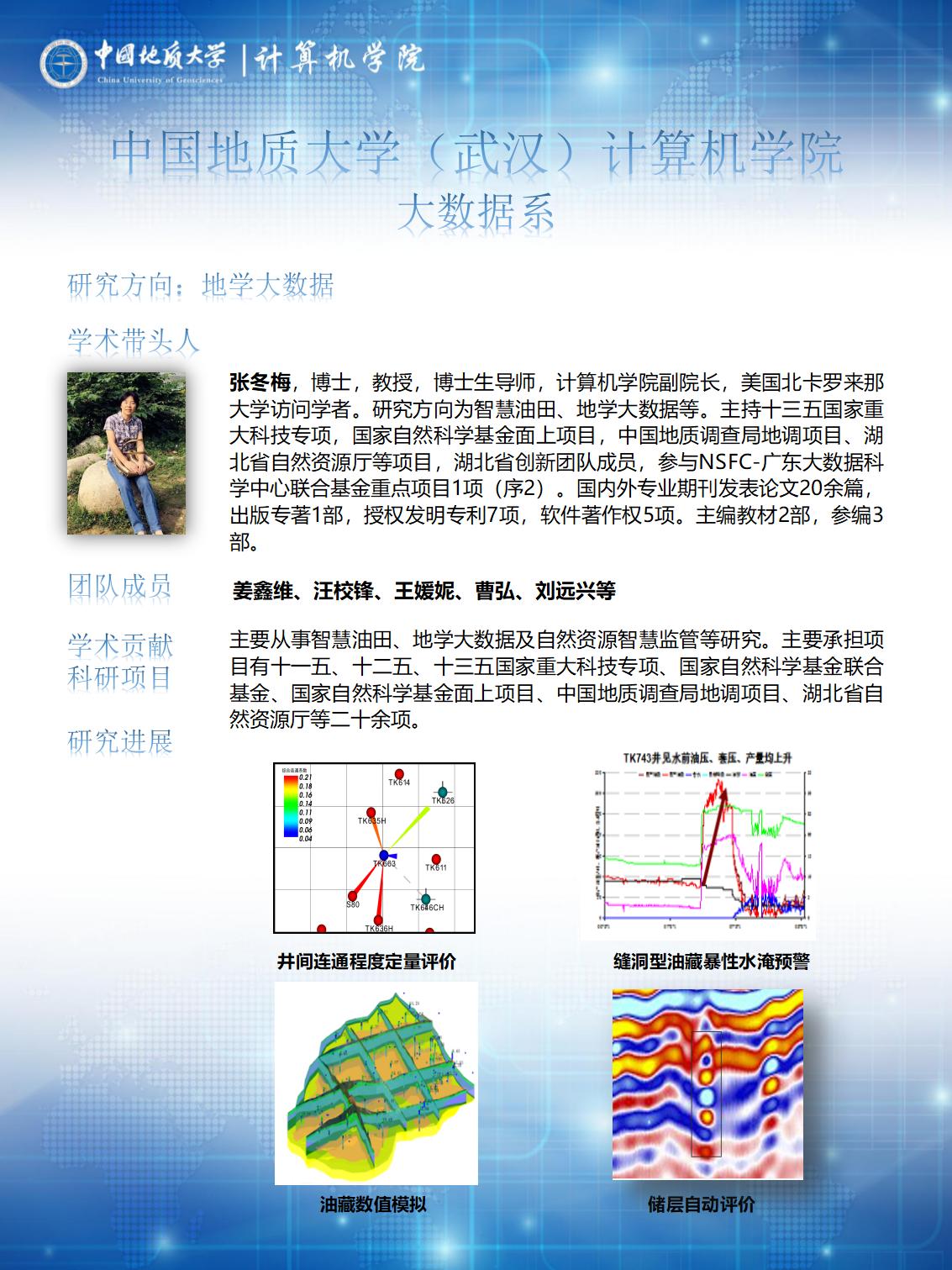 以王力哲教授、张冬梅教授、陈云亮副教授为学术带头人,主要围绕地球科学大数据原理与应用、地学大数据、大数据系统与云计算等方向开展科研工作,在地球科学大数据原理、方法及其在遥感、智慧城市、地质环境、生态、海洋等领域的应用,智能油田动态反演、多目标优化、深度学习、复杂大数据建模等,智慧医疗、智能电网、社交媒体及智慧教育领域的大数据系统建模、分析、计算及决策应用等方面取得了一系列研究成果。