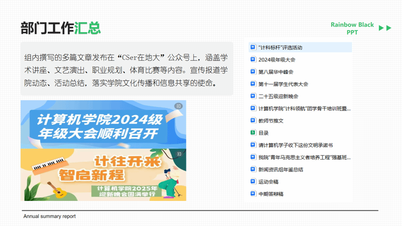 学风部深耕学风建设与青年成长,打造“新生入学指南”“计科E课堂”“保研分享会”“宿舍文化节”等特色活动,其中“计科E课堂”参与人数突破300人,活动满意度超90%。通过榜样引领、经验分享,引导学子树立优良学风、明确成长方向。