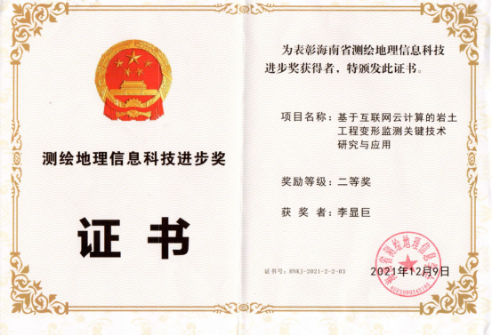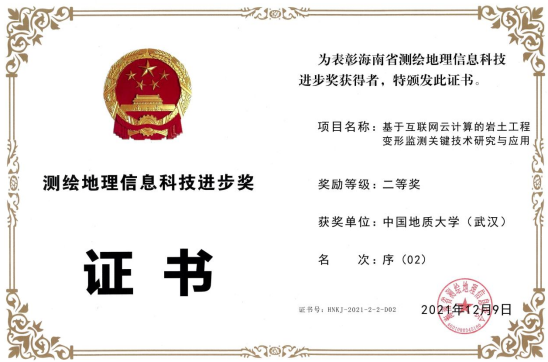 (通讯员:孙琨)2021年度海南省测绘地理信息学会年会于12月9日至10日在海口召开,由海南水文地质工程地质勘察院和我校等单位联合完成的科技成果《基于互联网云计算的岩土工程变形监测关键技术研究与应用》获得海南省首届测绘地理信息科技进步奖二等奖,我院李显巨副教授排名第三。