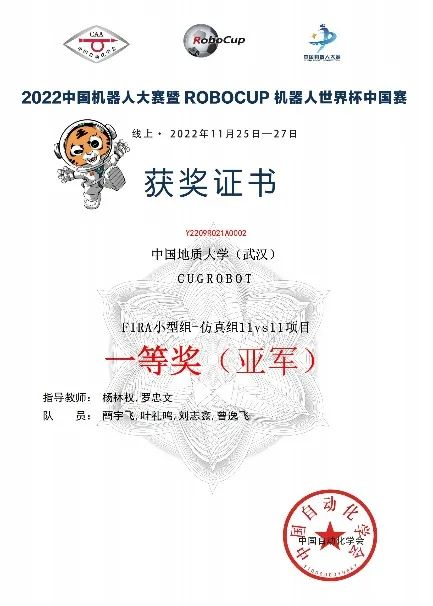 在杨林权老师和罗忠文老师的悉心指导下,CUG机器人团队勤奋备战、刻苦努力,在FIRA小型组-仿真组的5vs5和11vs11两项比赛中斩获冠军和亚军,2项一等奖。中国机器人大赛暨ROBOCUP机器人世界杯中国赛是国内规模最大、影响力最强、学术水平最高的机器人技术盛会之一。该赛事已于2020年成功入选中国高等教育学会《2015-2019年全国普通高校学科竞赛排行榜》,同时也在中国高等教育学会发布的《2021年全国普通高校大学生竞赛榜单》中。