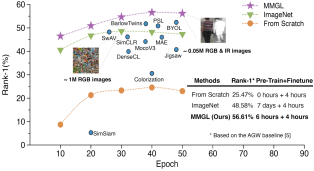论文的工作主要聚焦于解决多模态视频监控场景下行人重识别任务中的模态偏差预训练问题。研究表明,传统基于ImageNet的预训练方法会严重阻碍下游多模态任务性能的提升。因此,研究提出了一种新颖的自监督预训练方法-模态感知多粒度学习(MMGL),可在小规模的多模态数据集上直接开展预训练,无须依赖外部数据集和复杂的精调技巧,就能达到与ImageNet预训练相媲美的结果。经实验验证,相较于基于ImageNet的预训练,该方法训练速度更快、数据效率更高,并且表现出优秀的泛化性能和跨数据集迁移性能,这些结果表明,该方法具有推广到更多多模态图像检索任务的潜力。