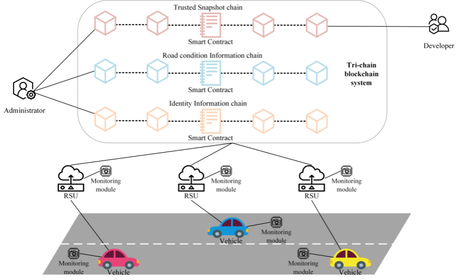 论文研究的问题是如何安全高效及时地共享路况信息,例如突发事故、落石塌方等。由于大规模部署传感器节点监测路况过于昂贵,采用众包的方法,利用车辆传感器本身的监测并报告这种危险信息将更容易部署,也更具有性价比。然而,这种众包方案也面临着一些困难,例如危险路况信息的更新及时性、用户上传虚假信息、窃取数据等。为此,论文提出了一个基于区块链的多链车辆联网系统,称为TriBoDeS,危险路况信息可在低信任的条件下由车辆自动识别并在区块链上公布。TriBoDeS还可以检测用户的恶意操作,并进行响应。还引入了一种角色的管理机制,实现对信息读取权限的粒度控制,同时建立了置信度规则来保证数据的真实性和时效性。此外,论文利用联盟链评估了方案的性能以及可行性。实验结果表明,与传统的单链系统相比,TriBoDeS系统在效率上提高了2.75倍。并且,在足够数量的车辆条件下,该系统能够在保证用户隐私的同时进行实时的信息可信共享。
